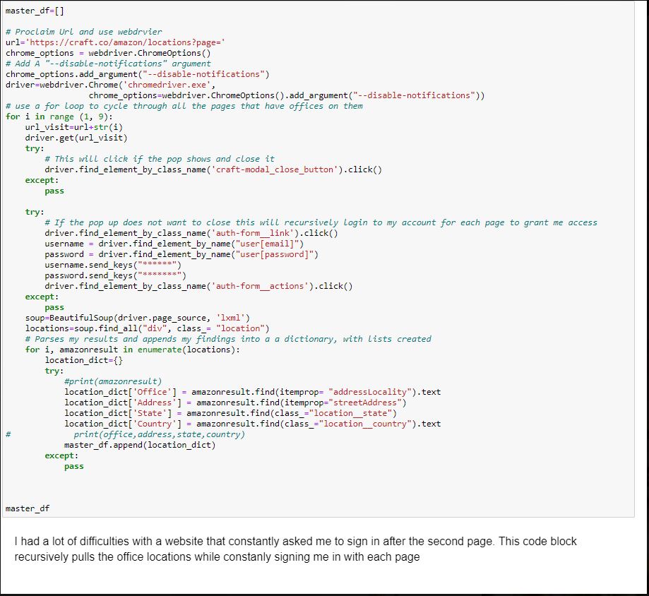 BaringFaang was a web app that I developed to compare growth amongest the Faang companies (Faceboo, Amazon, Apple, Netflix, Google, and Microsoft). It is a multi route flask app that uses Postgres SQl and and AWS server. The information is then querried via SQLalchemy. I did have a few trials and tribulations when creating this. One problem was getting the coordinates fro the office locations. I used Selenium in order to traverse throguh the html with Python and wrote code to recurrsively input my log in data on every fourth page to allow to me to coninute obtaining the information I needed. I also used Facebook prophet to predict revenue increase in the span of eight quarters or two years. Click Here for link to Web App.