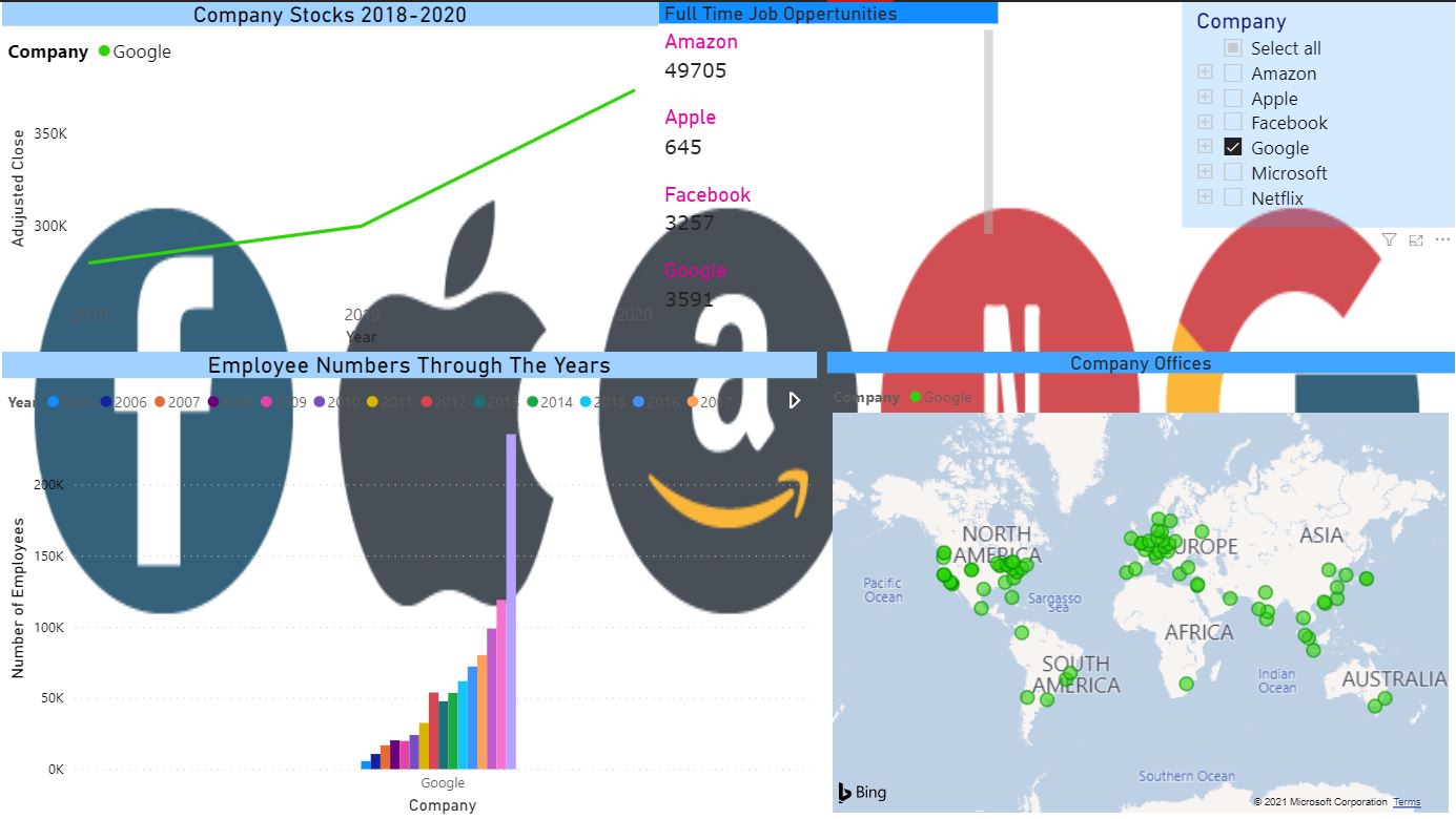This BI can be found my Heroku web application "BaringFaang" I wanted to see how the "Faang" companies compared in growth and staying power. I was very surprised when I saw what data came out of my findings. Here is the link:
