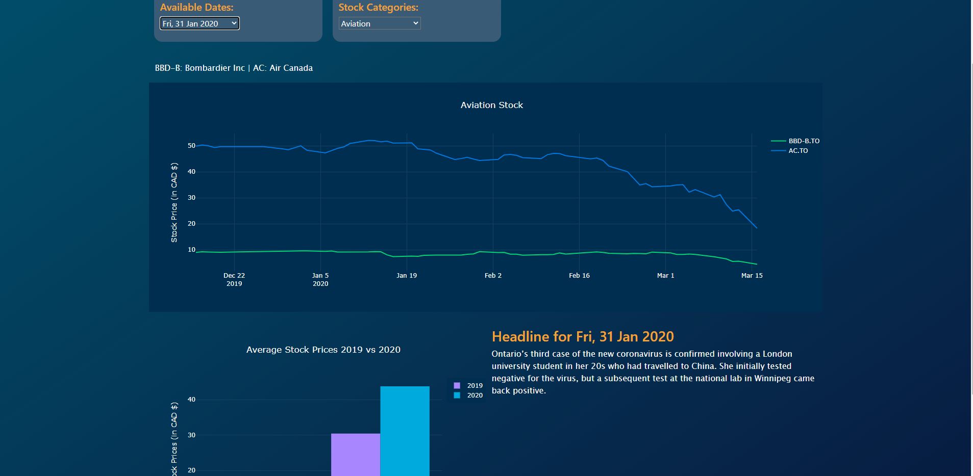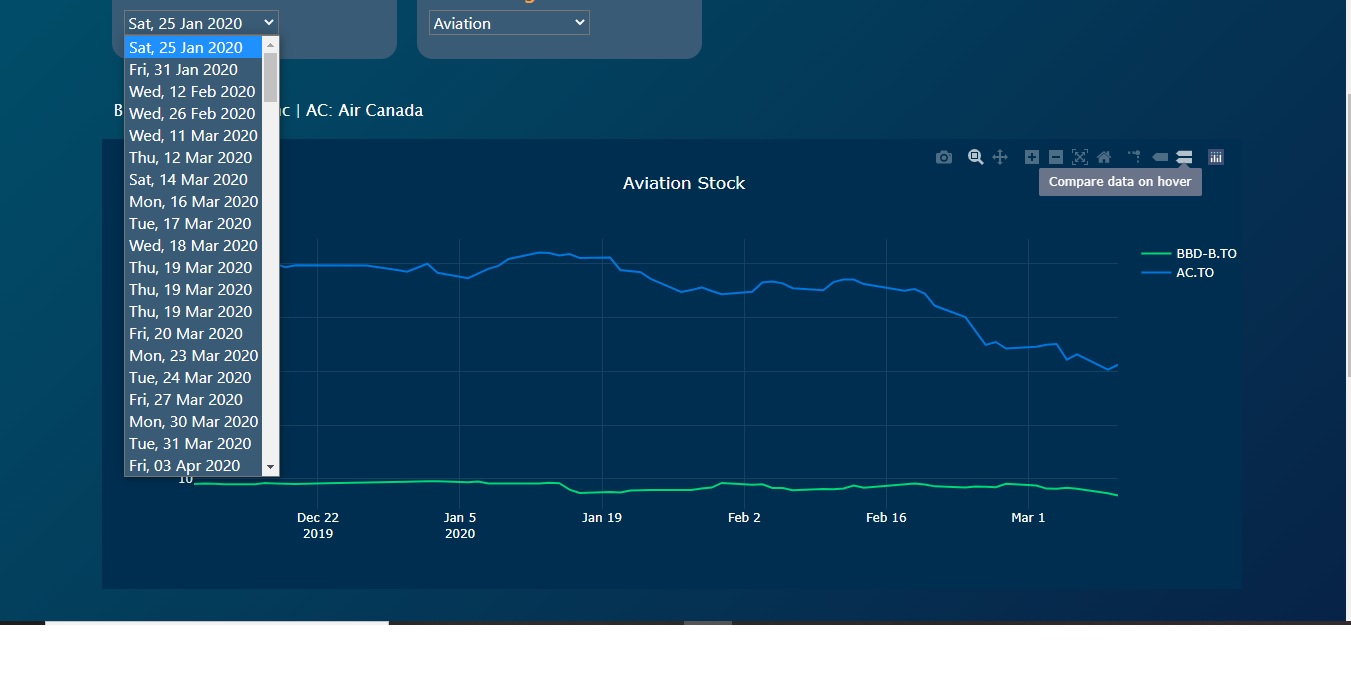 This was the first Web I built with a group of budding data engineers. It is a single route flask app that compares stock prices (from yahoo finances) amongest 4 different categories(Entertainemnt, Aviation, Technology, and Telecommunication) and shows the user an event published from the global news website effecting the Tronto area. There is also a bar graph to showcase the average amongest the 4 monthes(quarters). In this project I was responsilble for making the line graphs using plotly Click Here for link to Web App.